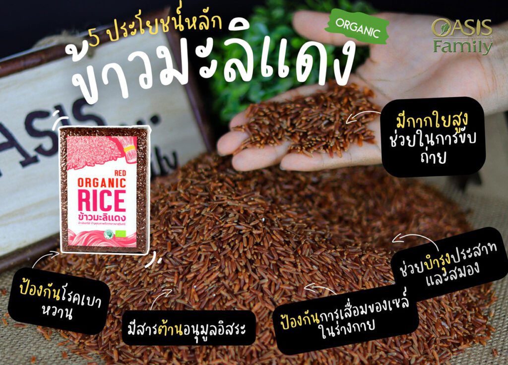 ข้าวหอมมะลิแดงเป็นข้าวเจ้าที่ปลูกได้ปีละ 1 ครั้ง เมล็ดเรียวยาว สีน้ำตาลอมแดงเข้ม เมื่อหุงสุกจะนุ่ม หุงขึ้นหม้อและให้สัมผัสที่คล้ายข้าวหอมมะลิ มีระดับน้ำตาลต่ำ ช่วยในการควบคุมน้ำหนักหรือคุมระดับน้ำตาลในเลือด รวมถึงช่วยบำรุงผิวพรรณและความงาม ชะลอการเกิดริ้วรอย
